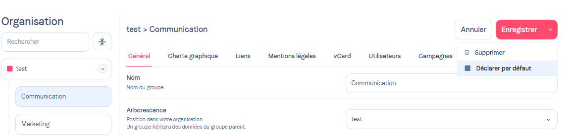 Sélectionnez le groupe que vous souhaitez définir par défaut, puis cliquez sur Modifier. Cliquez sur la flèche proche d’Enregistrer puis cliquez sur Déclarer par défaut.