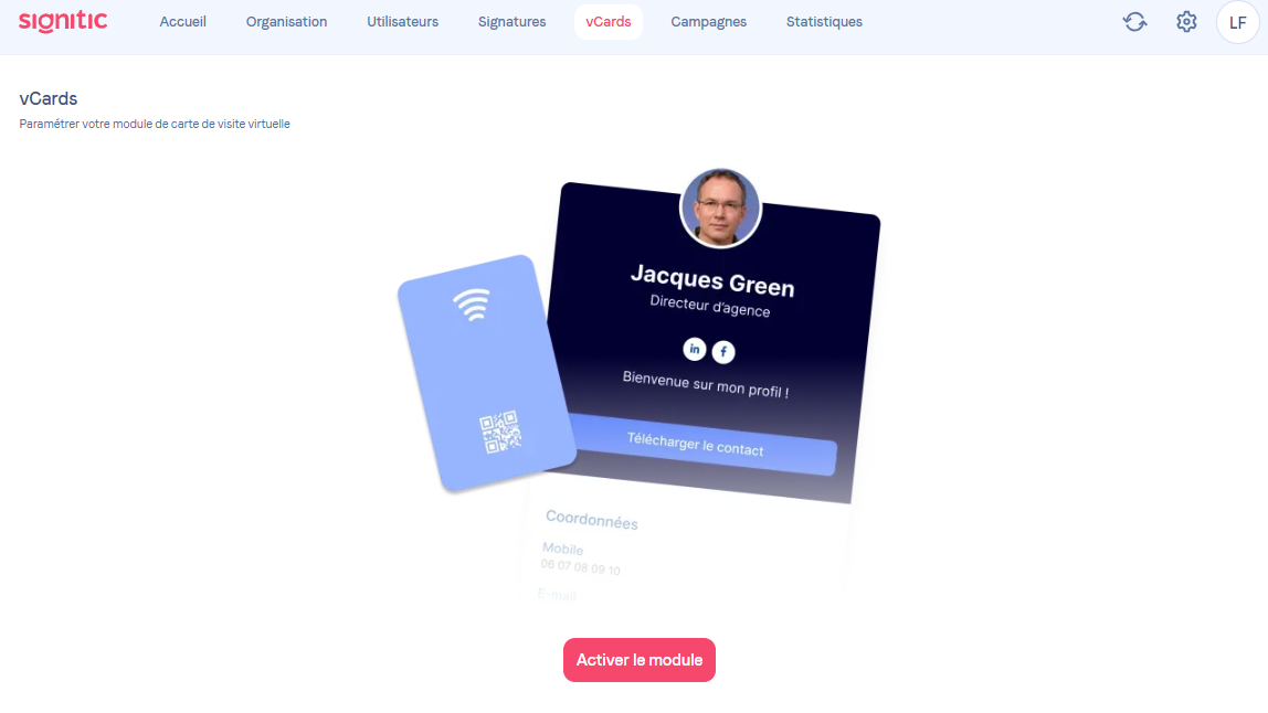 Il est nécessaire d'avoir un rôle d'administrateur principal pour effectuer cette action. Connectez-vous à votre compte Signitic, puis rendez-vous dans les paramètres de votre compte. Ouvrez l'onglet vCard en dessous de celui des Signatures, puis cliquez sur Activer le module.