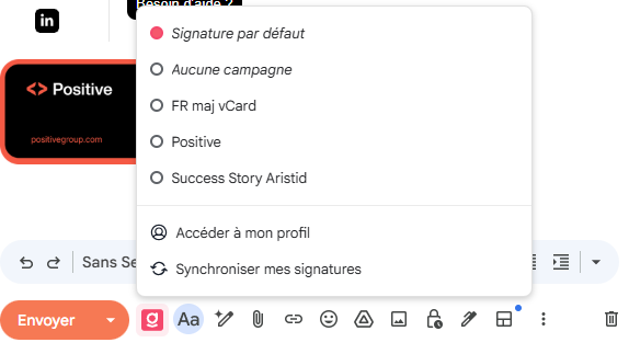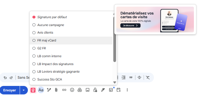 Utiliser une campagne Depuis Gmail, l’utilisateur peut accéder à différentes fonctionnalités afin de gérer l’affichage de sa signature.