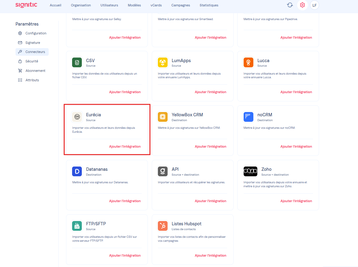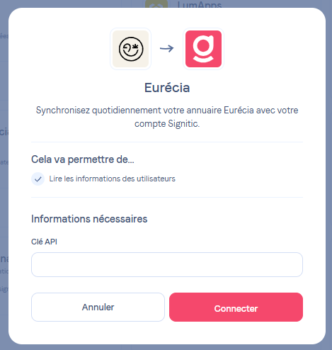 Afin de bénéficier de vos données présentes dans votre annuaire Eurécia, Signitic possède une intégration dont l'installation ne prend que quelques clics.