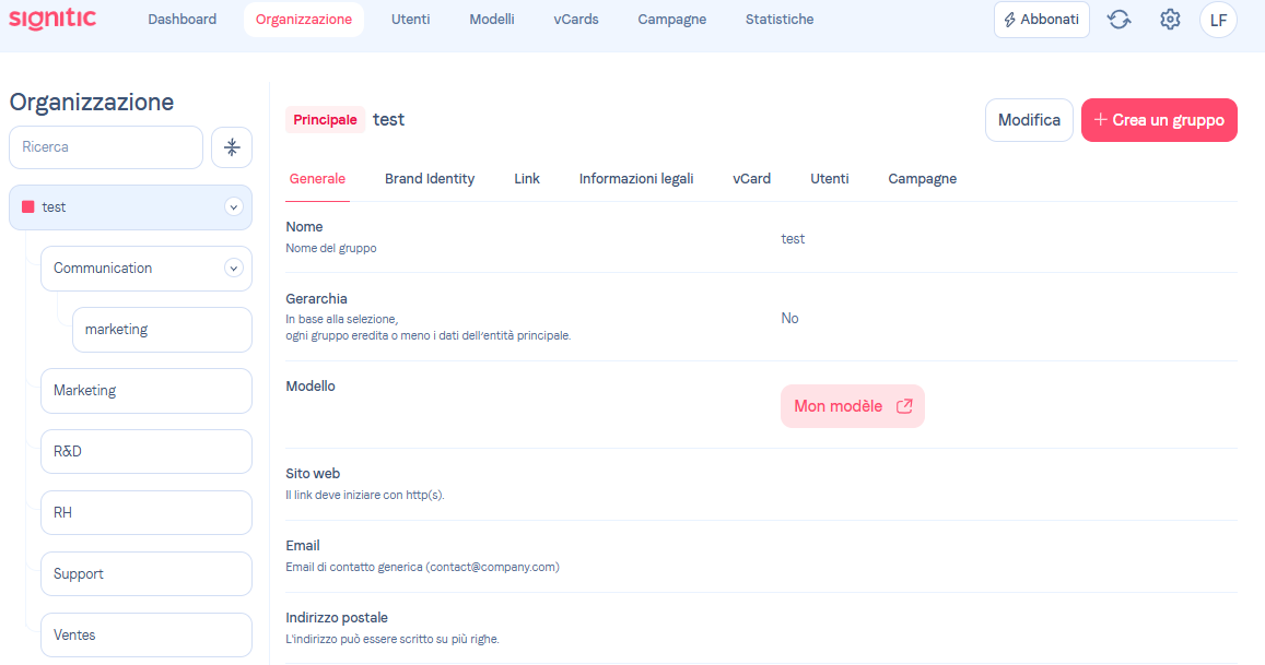 Suggerimento:Per automatizzare Signitic il più possibile, ti consigliamo di compilare in anticipo tutte le informazioni relative al tuo Gruppo principale, in modo che il concetto di ereditarietà possa essere applicato ai tuoi gruppi di livello 2 e 3.
