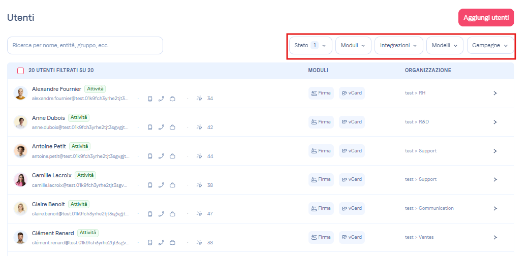 Per eseguire azioni raggruppate sui tuoi utenti o controllare i dati, puoi filtrare la pagina degli utenti in base a determinati criteri disponibili nella parte superiore della pagina.
