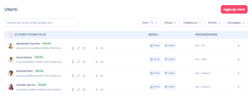 Per copiare la firma di un utente, vai su Utenti e poi accedi al profilo di un utente.