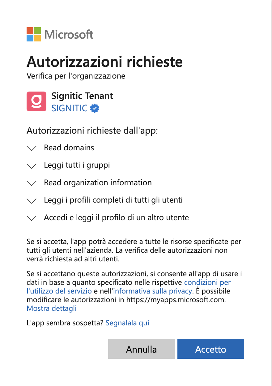 Le autorizzazioni richieste sono utilizzate per recuperare l'elenco dei vostri utenti e dei relativi attributi.
