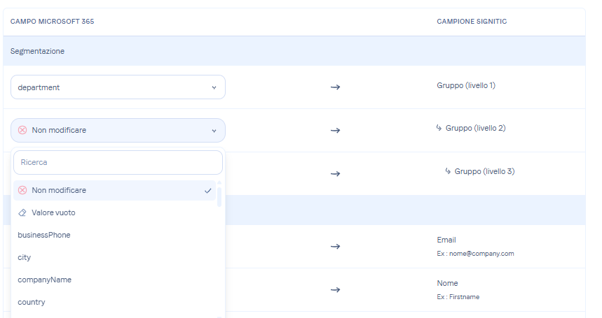 Nella colonna di destra avete l'elenco del campo di destinazione lato Signitic e, a sinistra, la possibilità di scegliere il campo della vostra directory Microsoft o Google.
