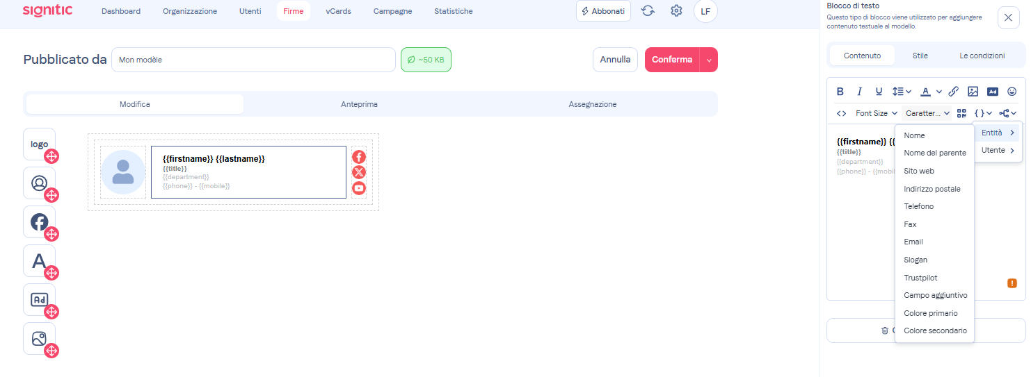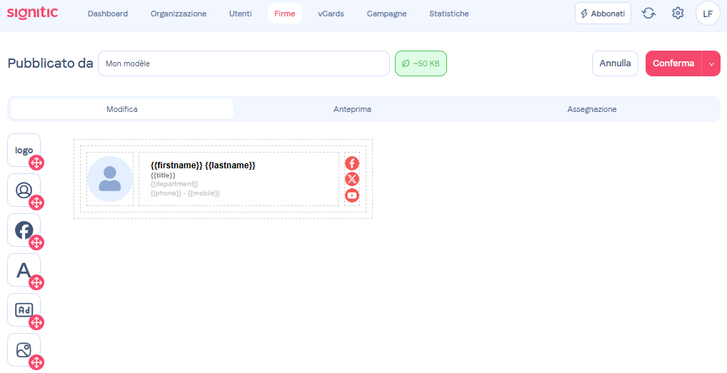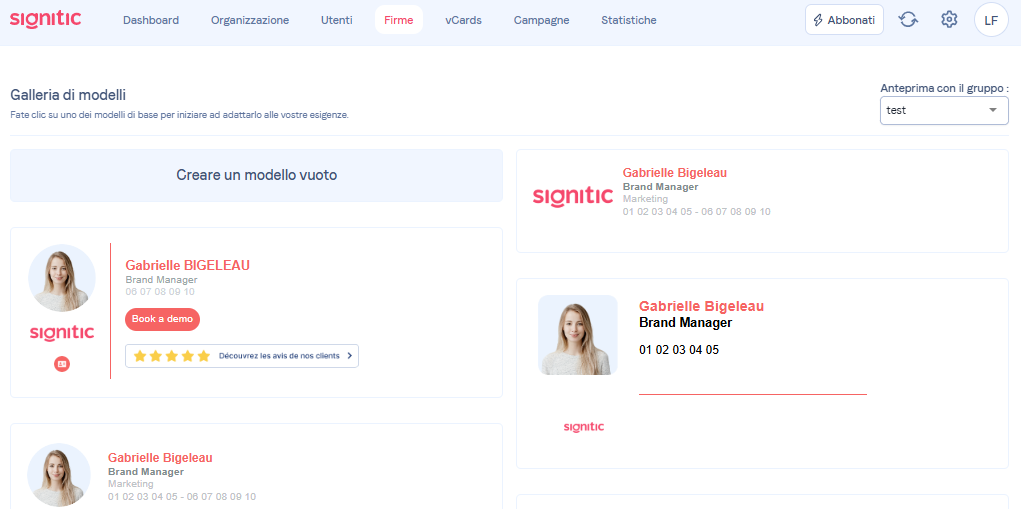 Un modello di firma ti consente di generare una firma per ciascuno dei tuoi utenti in base ai dati inseriti nel loro profilo ma anche nella tua organizzazione Signitic.