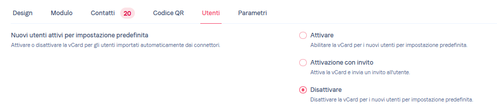 Si può anche attivare la vCard di default per i tuoi utenti, grazie a questa opzione dalla scheda Utenti.