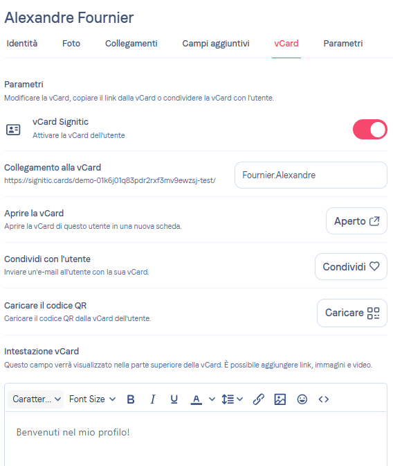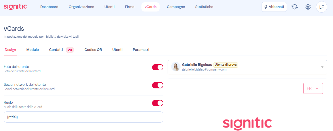 Vai questa volta nella scheda "Utenti", poi in "vCard" troverai l'opzione vCard Signitic, ti basta selezionarla per attivare la vCard.