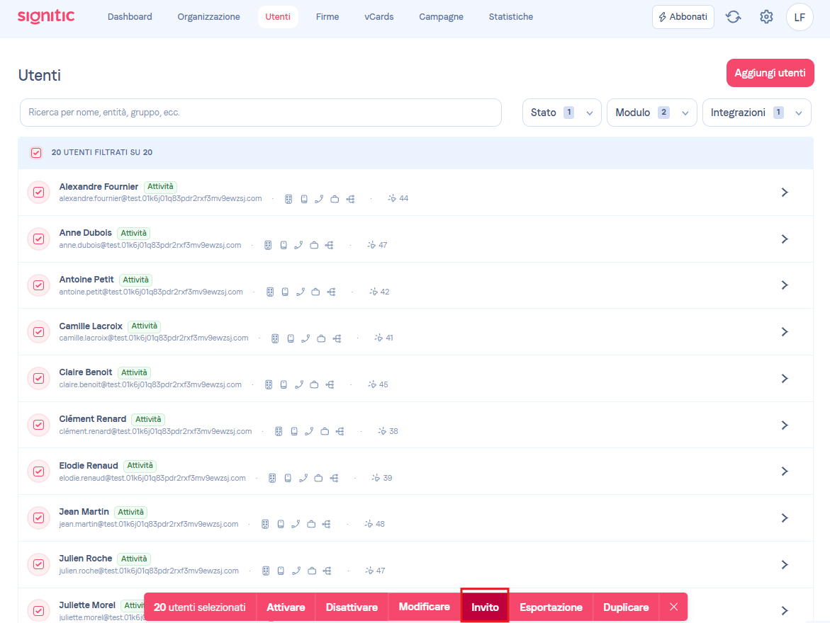 Se vuoi condividere le vCard di più utenti, niente di più facile, vai su la scheda "Utenti", seleziona gli utenti interessati poi, "Azione di gruppo" e l'opzione "Condividi le vCard".