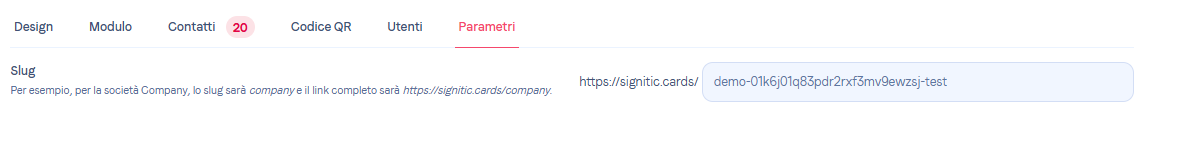 Una volta attivata ricordati di aggiungere uno SLUG per la tua azienda nelle impostazioni della vCard.