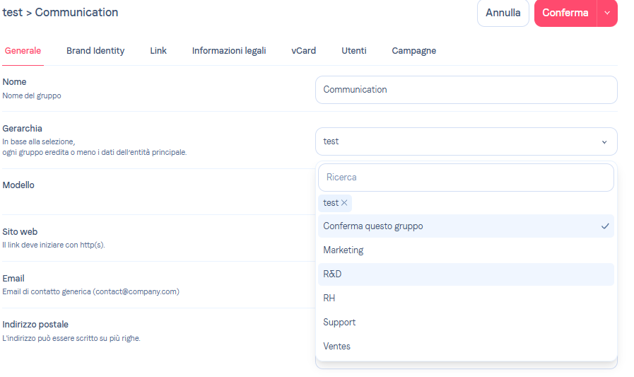 Creare un gruppoI vostri gruppi riflettono diversi livelli gerarchici. Ad esempio, potete avere un gruppo principale, quindi una specifica entità, seguita da reparti all’interno di tale entità come Risorse Umane, Vendite, ecc.