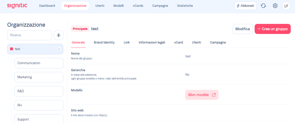 Questo articolo illustra come creare un gruppo nella scheda Organizzazione, così da sfruttare appieno tutte le funzionalità offerte da Signitic.