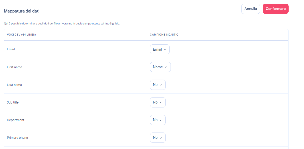 I campi "Campo Signitic" (in blu) corrispondono ai campi presenti nel tuo account Signitic.