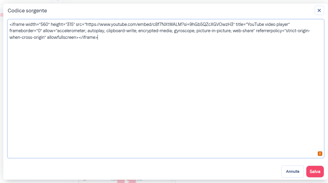 Una volta aperto il campo per la modifica del codice sorgente, incolla il codice preso da Youtube: