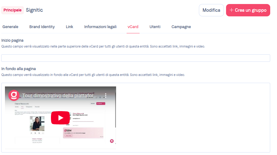 Torna alle impostazioni della tua VcardVai nel gruppo in cui desideri aggiungere il video nella Vcard.
