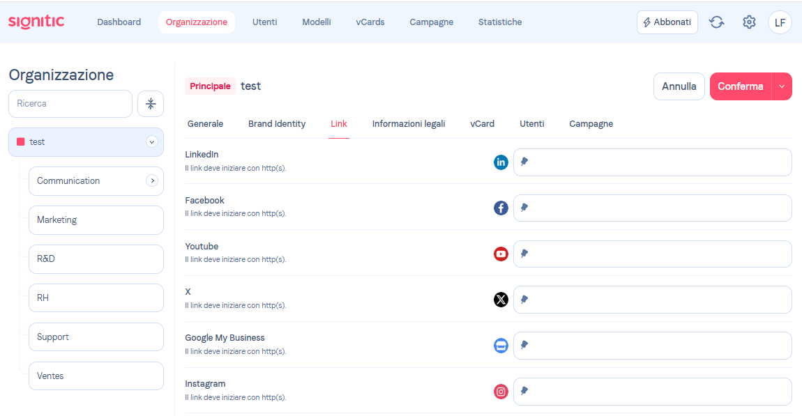 Una volta selezionato il gruppo che desideri modificare, vai alla sottoscheda "Link" per aggiungere il collegamento che desideri.