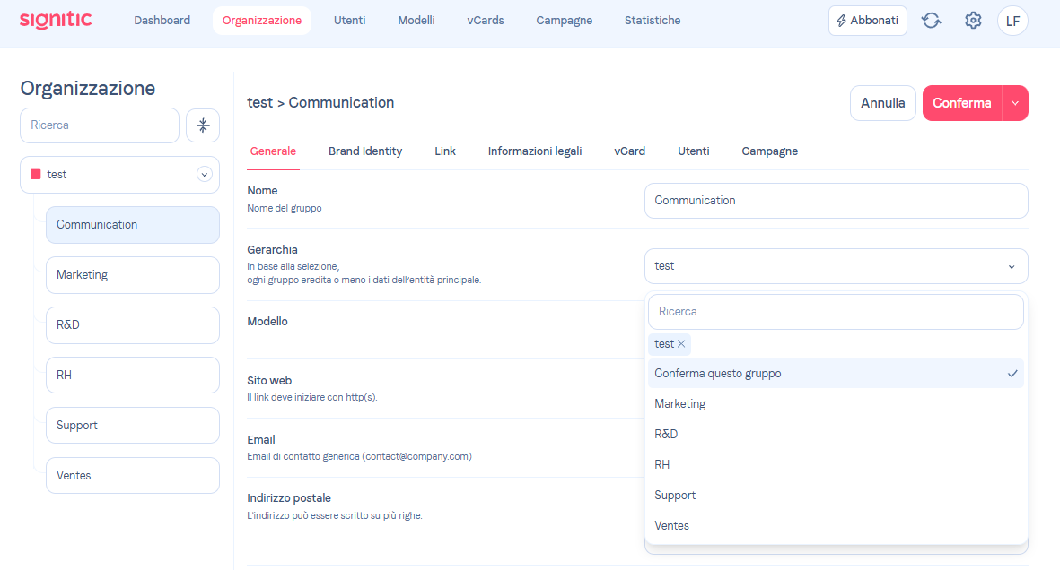 Una volta completato, accedete alla scheda Organizzazione, selezionate il gruppo interessato nella scheda Organizzazione. Cliccate su "Modifica". Nei parametri della gerarchia, scegliete il nuovo gruppo padre o impostate il gruppo come gruppo di livello 1 selezionando Nessuno.