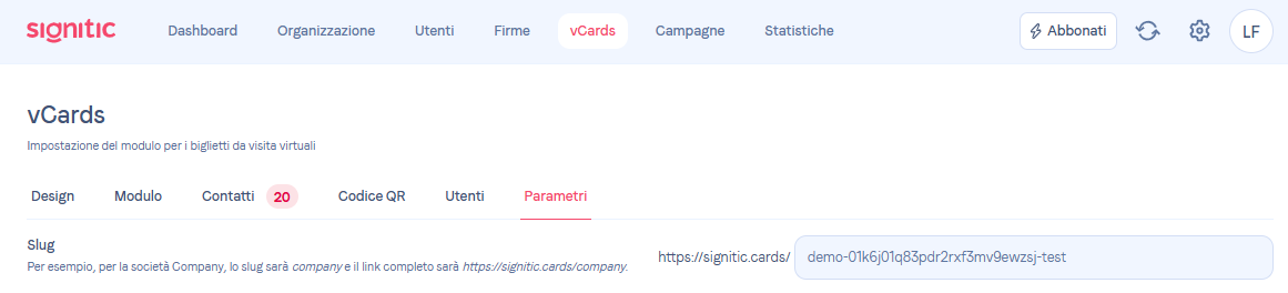 Durante l'attivazione del modulo Vcard, è necessario attivare lo "Slug" principale della vostra azienda.