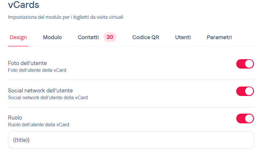 Disattivare la visualizzazione dei campiI campi delle vCards possono essere disattivati, permettendo di scegliere ciò che desiderate aggiungere o meno alle vostre vCards.