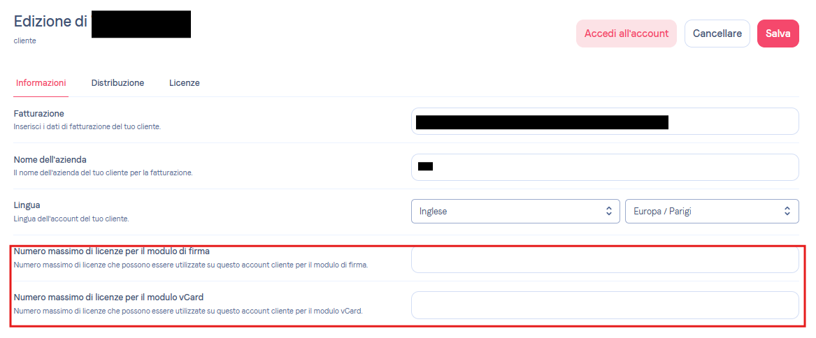 Una volta fatto, nella sottoscheda Informazioni puoi mettere il limite di licenza che vuoi. Questo può riguardare sia le firme che le vCard.
