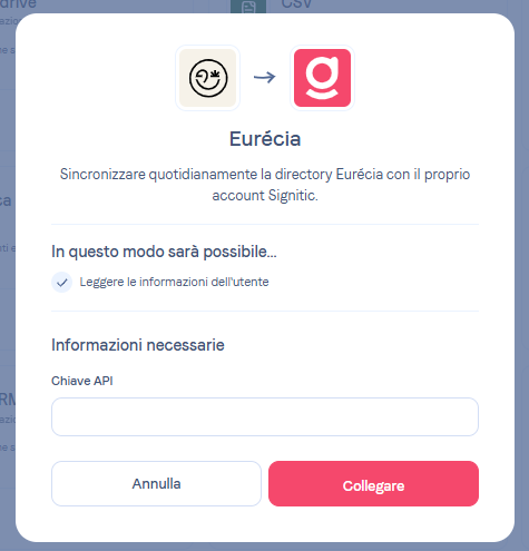 Cliccando su “Ajouter une intégration”, vi verrà richiesta la chiave API del vostro account Eurécia: