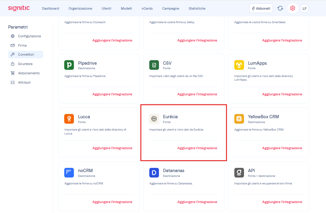 Per poter beneficiare dei vostri dati presenti nel vostro elenco Eurécia, Signitic dispone di un’integrazione la cui installazione richiede solo pochi clic.