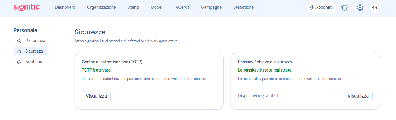 Come attivare la doppia autenticazione?Acceda alla sezione Il mio account > Sicurezza (oppure direttamente su app.signitic.com/account/security).