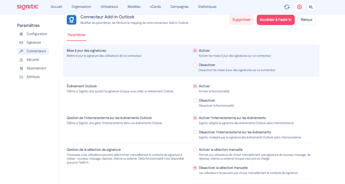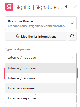 Informação útilSe a opção estiver desativada, a assinatura é automaticamente aplicada de acordo com as regras definidas no Signitic. A automatização permanece ativa, mesmo que a opção esteja ativa.