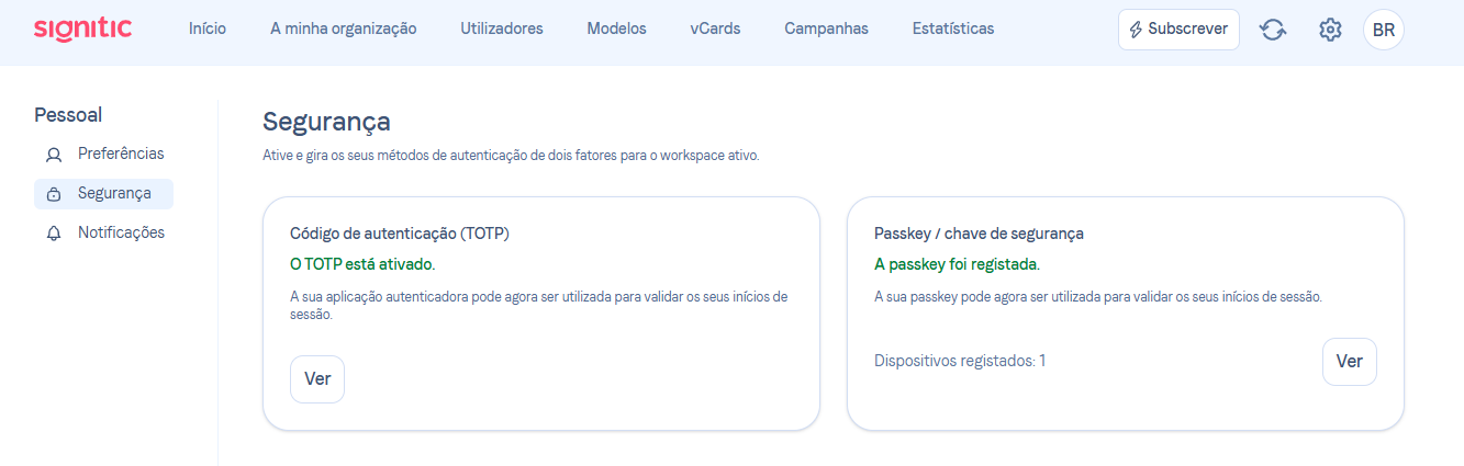 Como ativar a autenticação de dois fatores?Aceda a Minha conta > Segurança (ou diretamente em app.signitic.com/account/security).